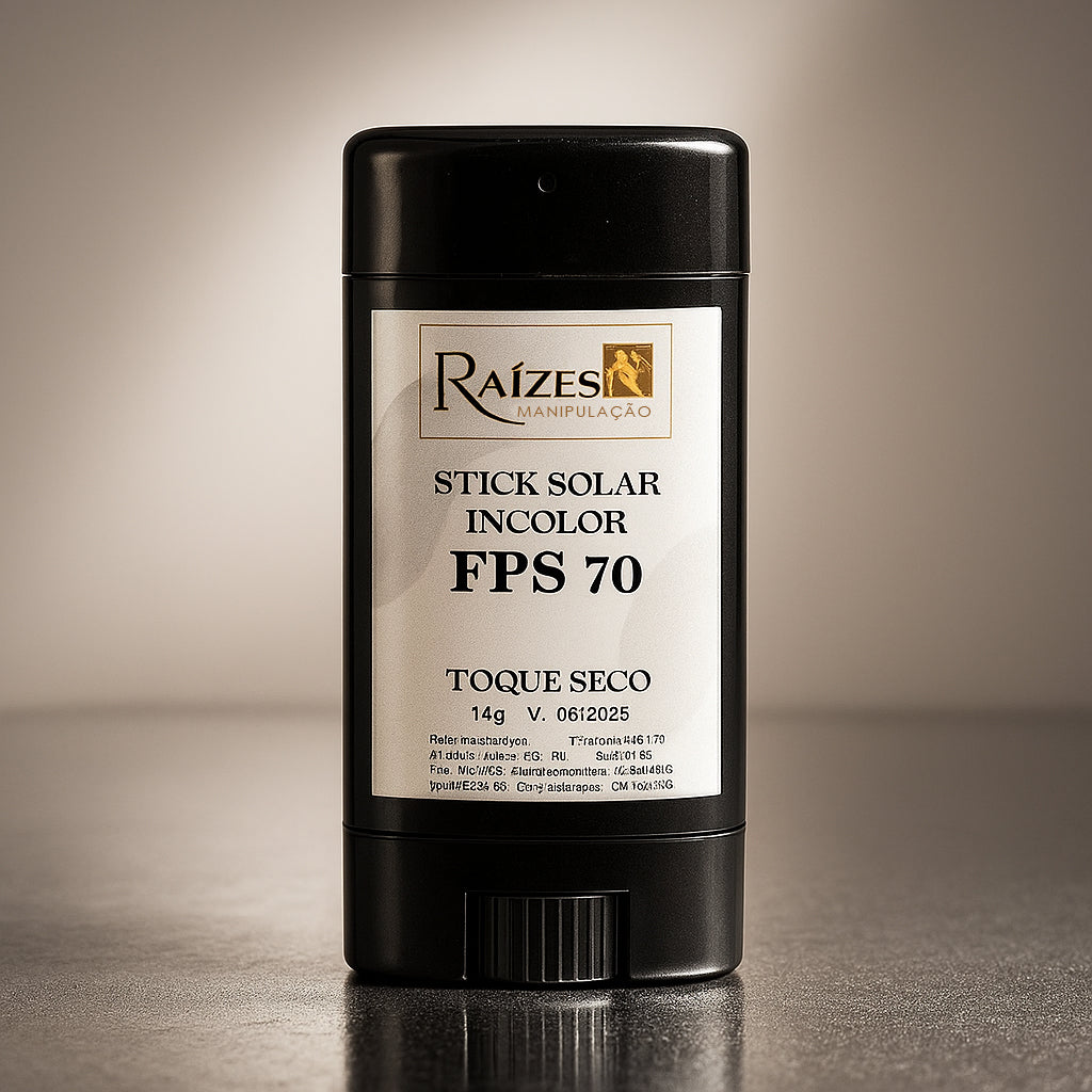 Filtro solar stick FPS 70/ FPUVA 23,5 incolor, contém essência suave. Embalagem stick .